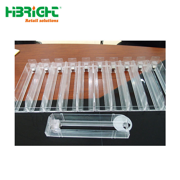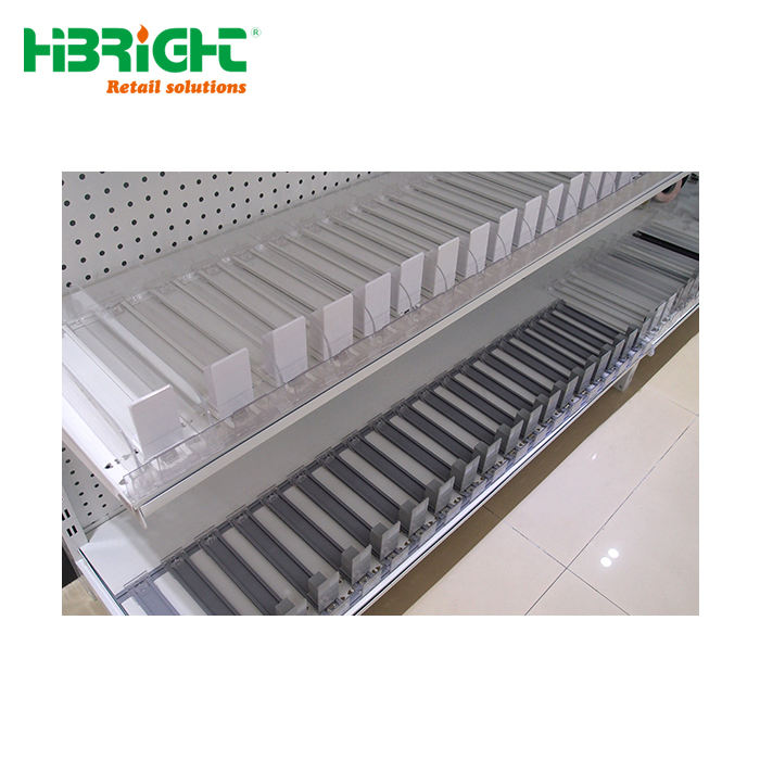 High Quality Clear Acrylic Tobacco Cigarette Rack Bottle Drink Can Plastic Display Shelf Divider and Spring Pusher System