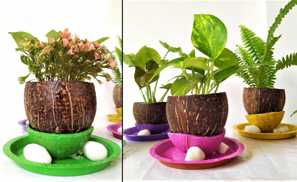 High Quality Coconut Shell Plant Pot Hanger / Coconut Planter Flower Pot With Hanging Rope with Decoration Garden Custom Design