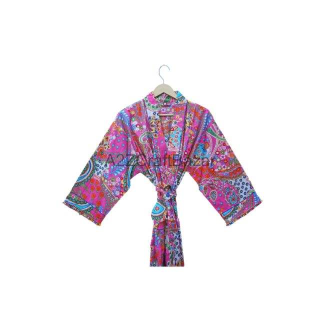 High Quality Cotton Block Print Fabric Kimono Wrap Design Belt Tie Closure Long Sleeve Bathrobe Sleep Lounge Spa Women Clothing