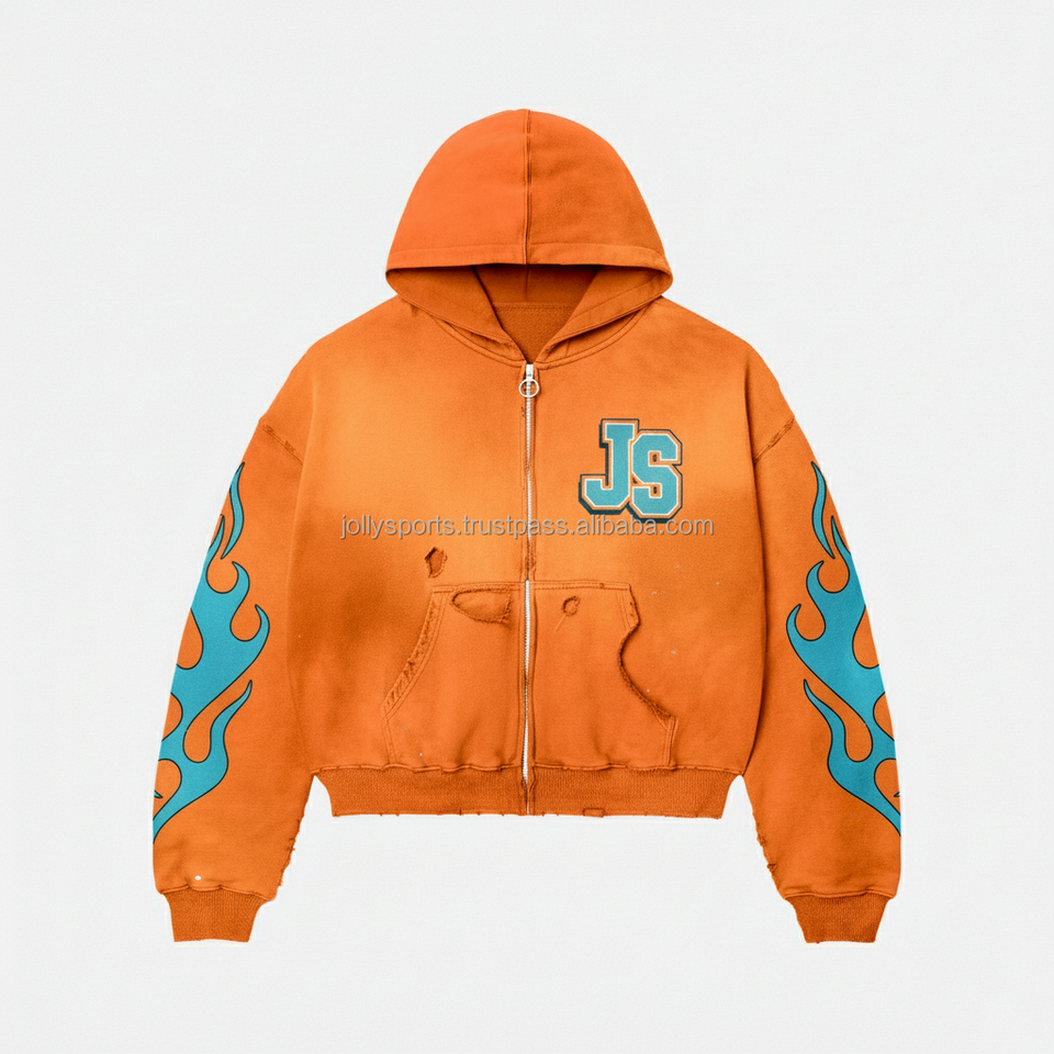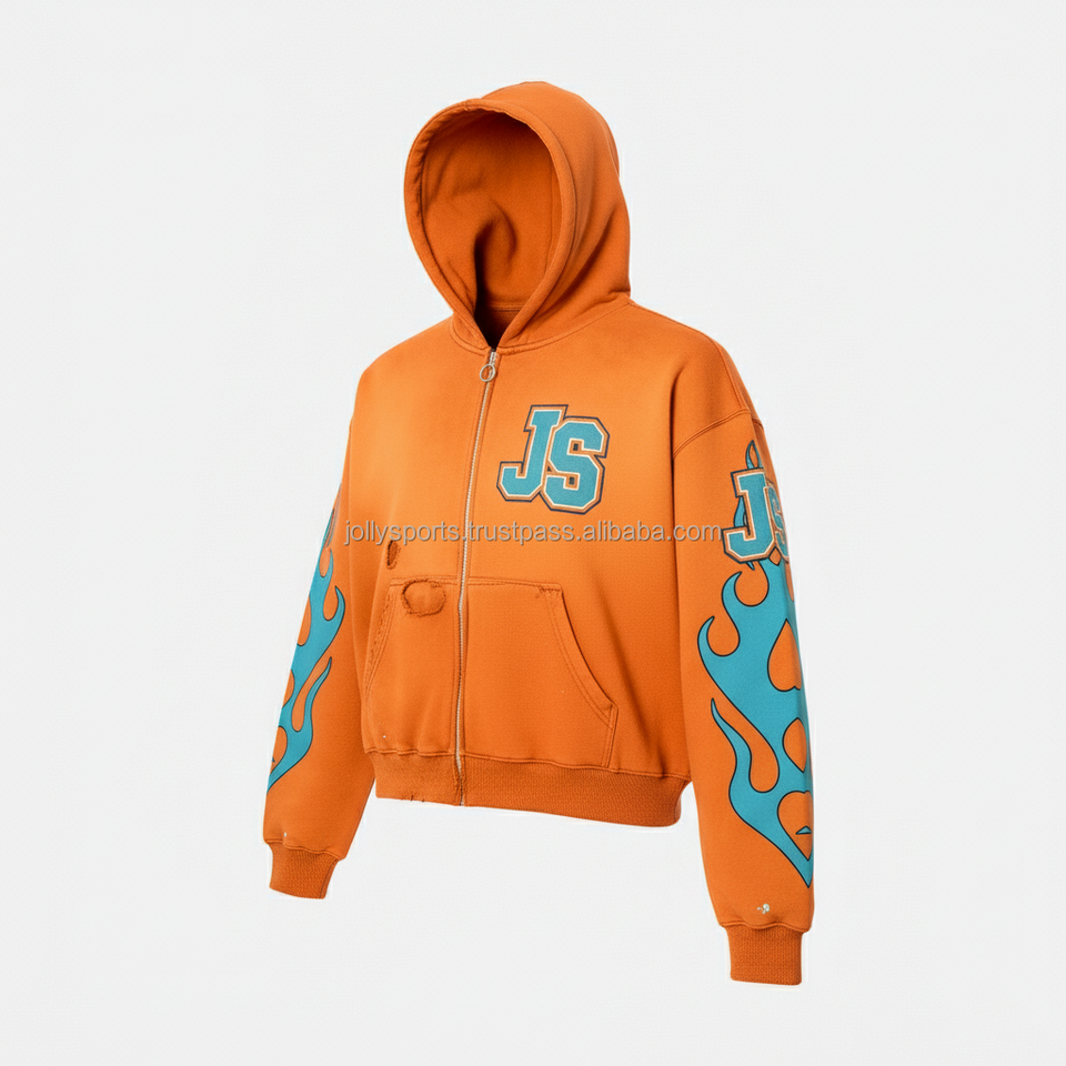 High Quality Cotton Fleece Zip Up Hoodie Orange Color With Blue Sleeves Custom Logo Embroidery Screen Print Basics Hoodie