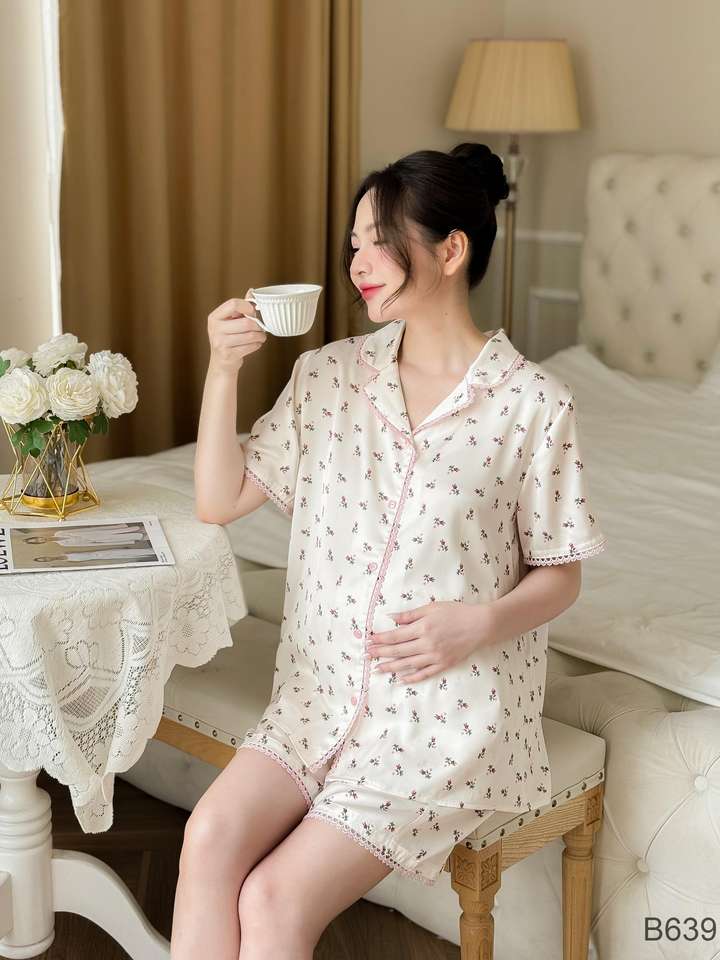 High Quality Cream Floral Silk Shorts Set for Pregnant & Postpartum Women Minimalist Design Breathable No Fading Daily Wear B639