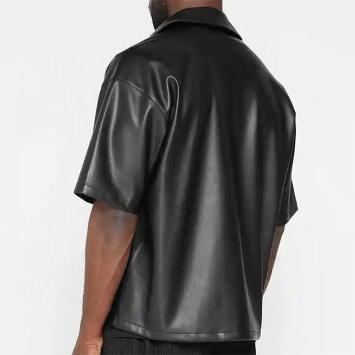 High Quality Custom Applique Embroidery Loose Fit Short Sleeve Button up T Shirt Vegan Leather Short Sleeves T Shirt for Men's