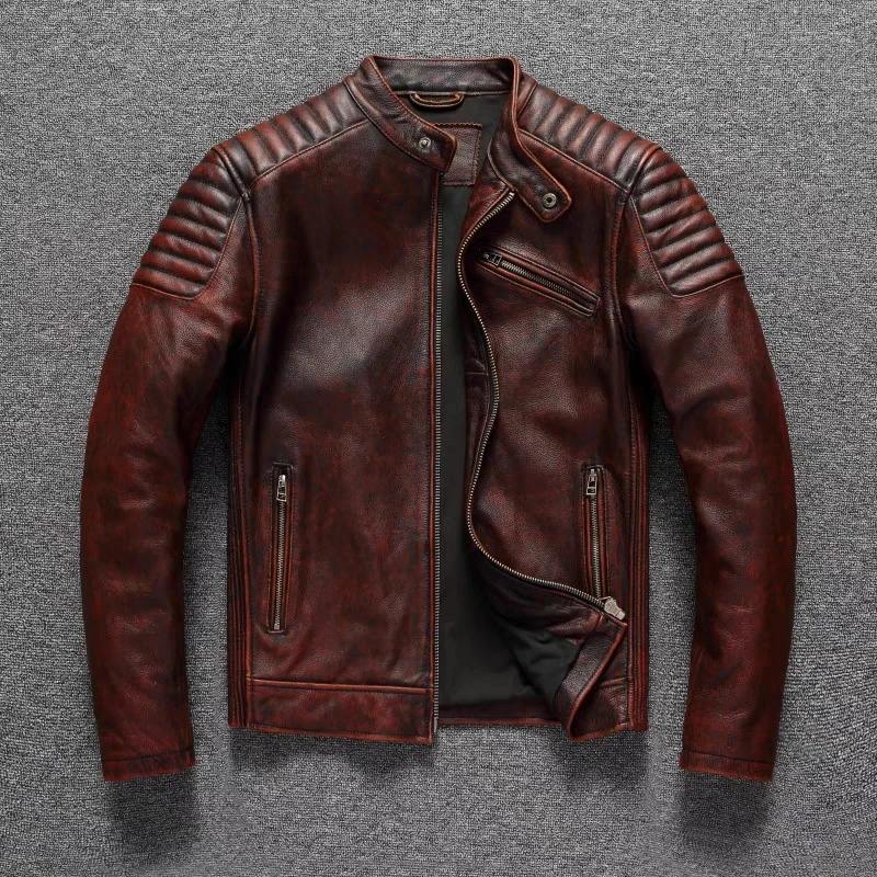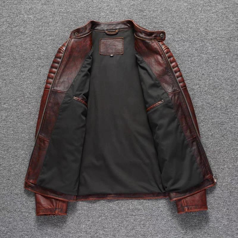 High Quality Custom Black Coated Genuine Leather Stand Collar Vintage Style Letterman Varsity Jacket for Men