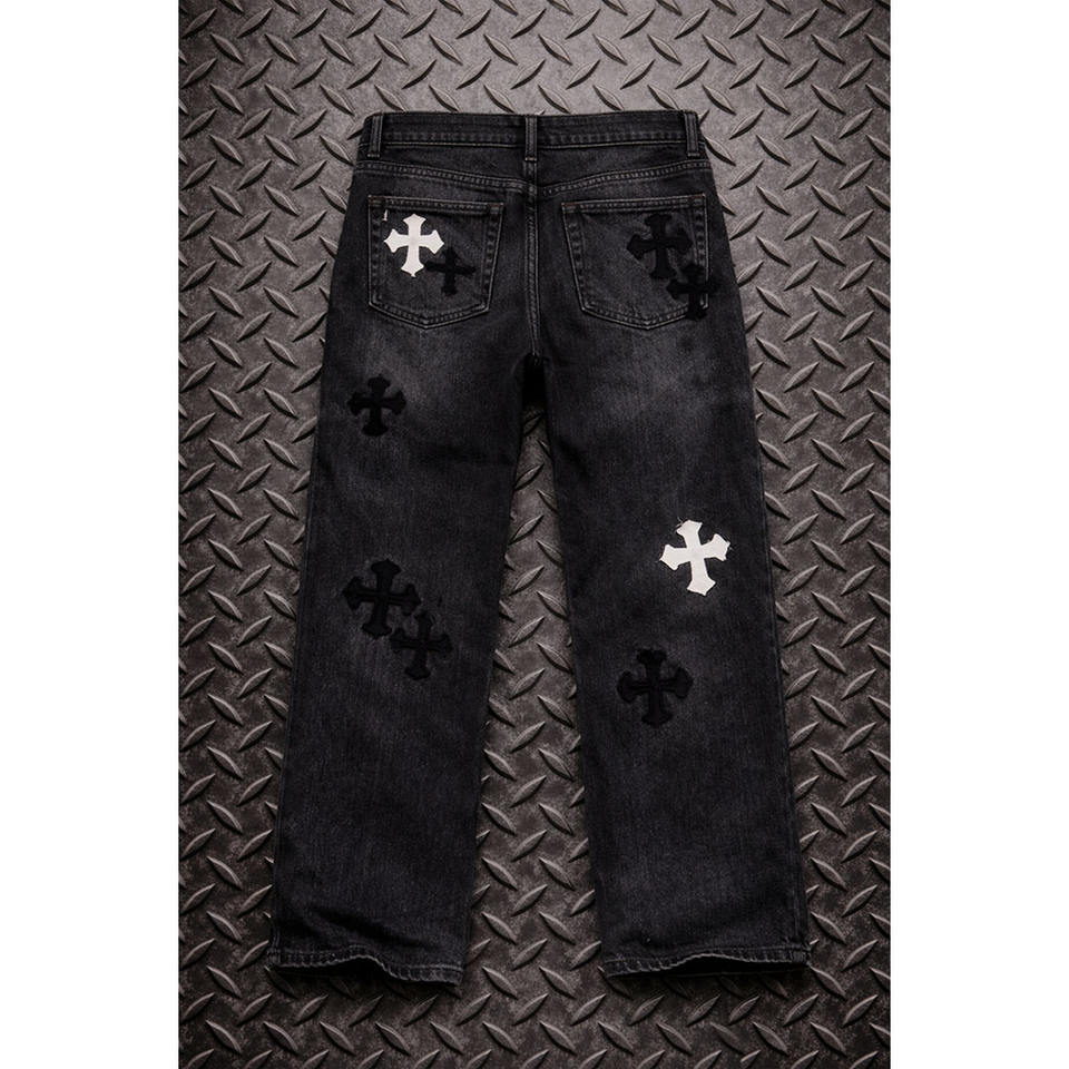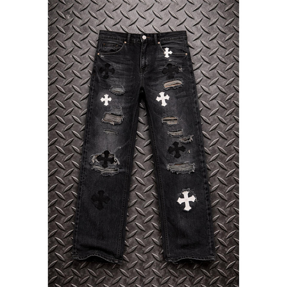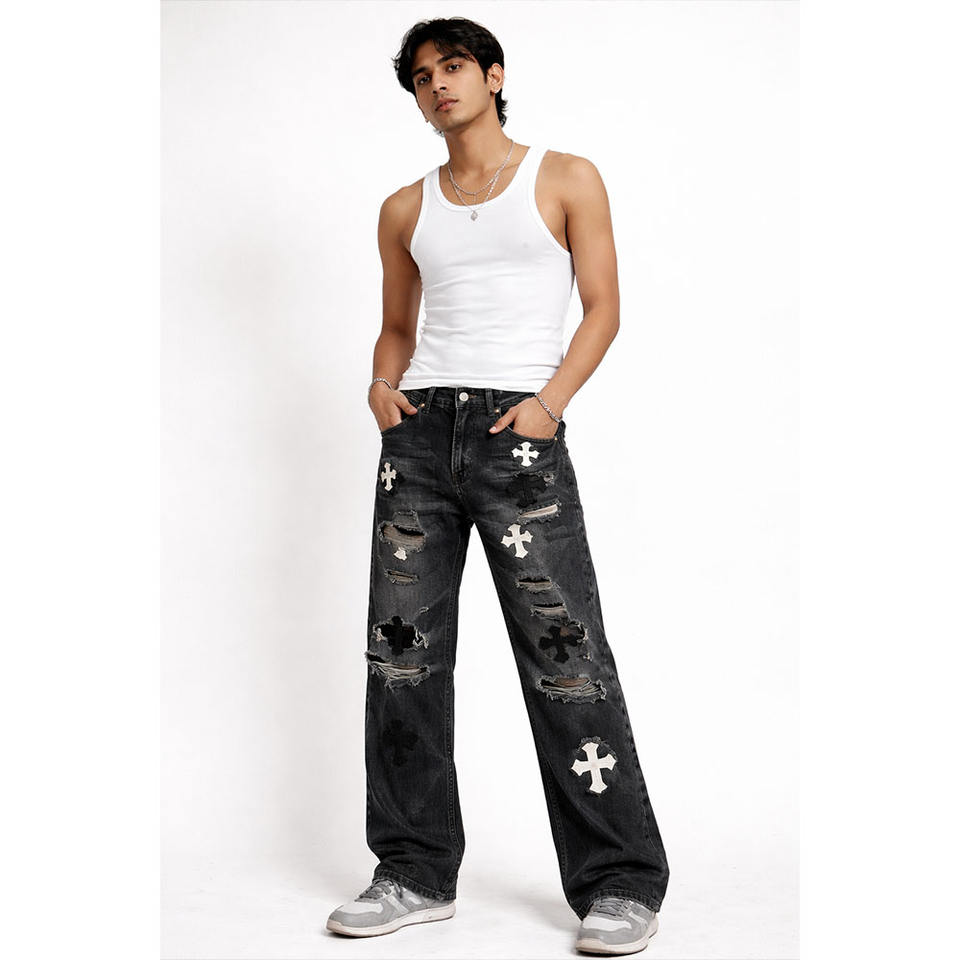 High Quality Custom Design Distressed Cross Patch Denim Jeans Men Stretch Baggy Trousers Fashion Straight Ripped Jeans Men