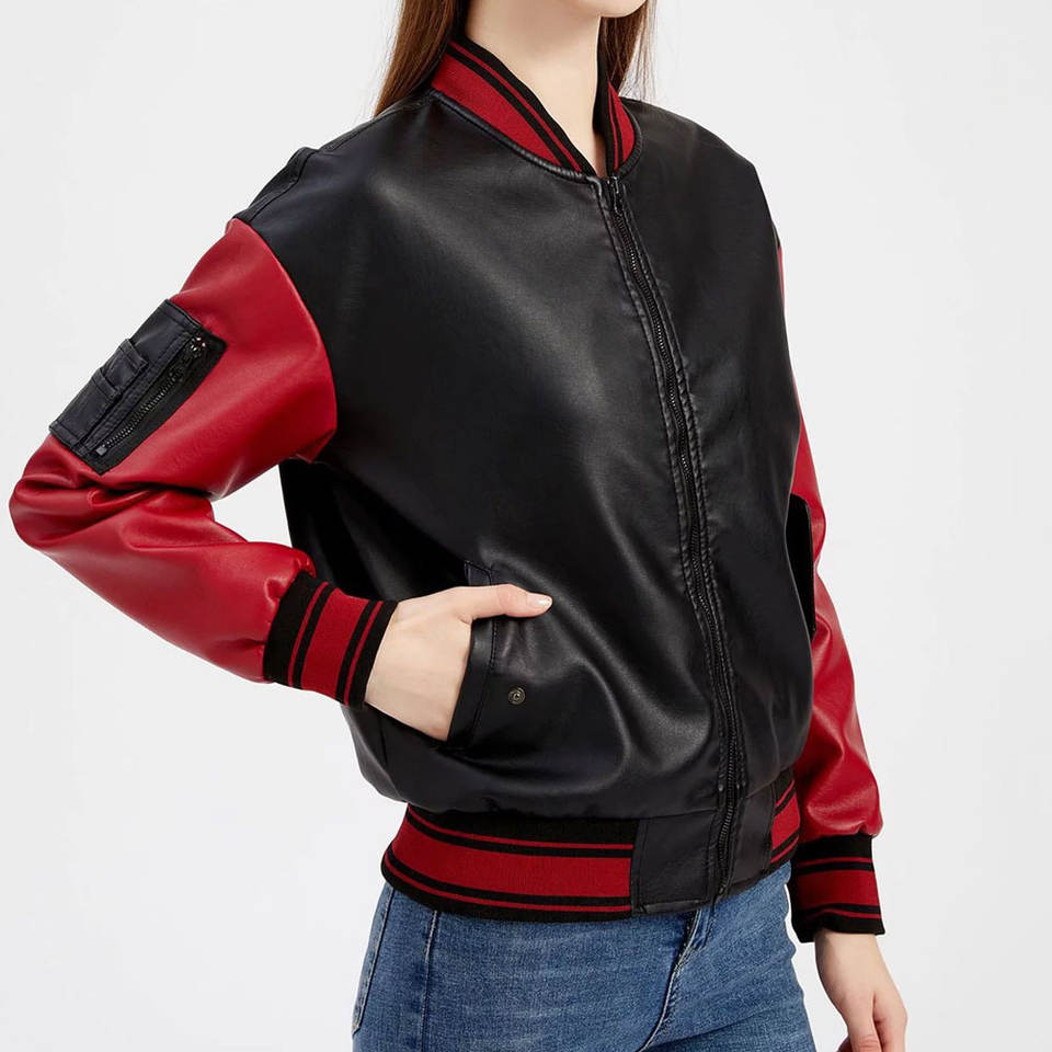 High Quality Custom Leather Sleeves Jacket with Custom Chenille Embroidery Women Genuine Leather Jackets