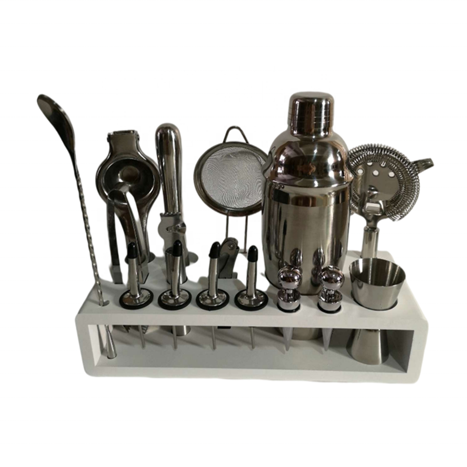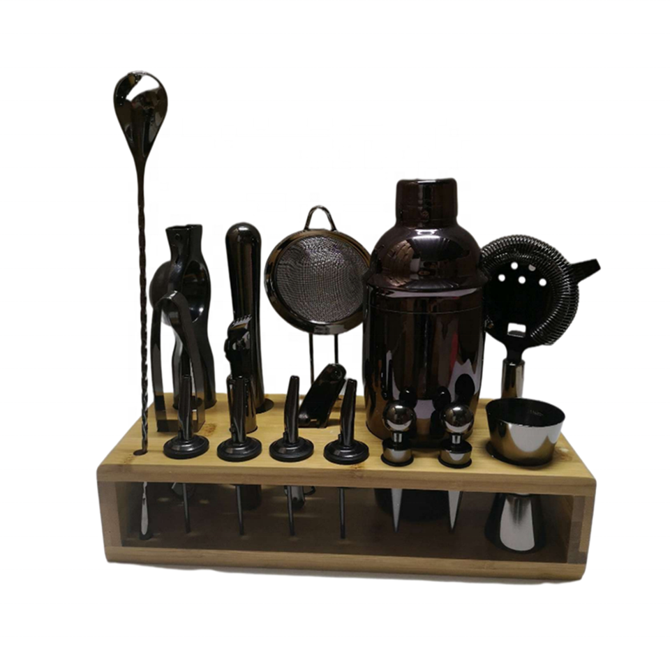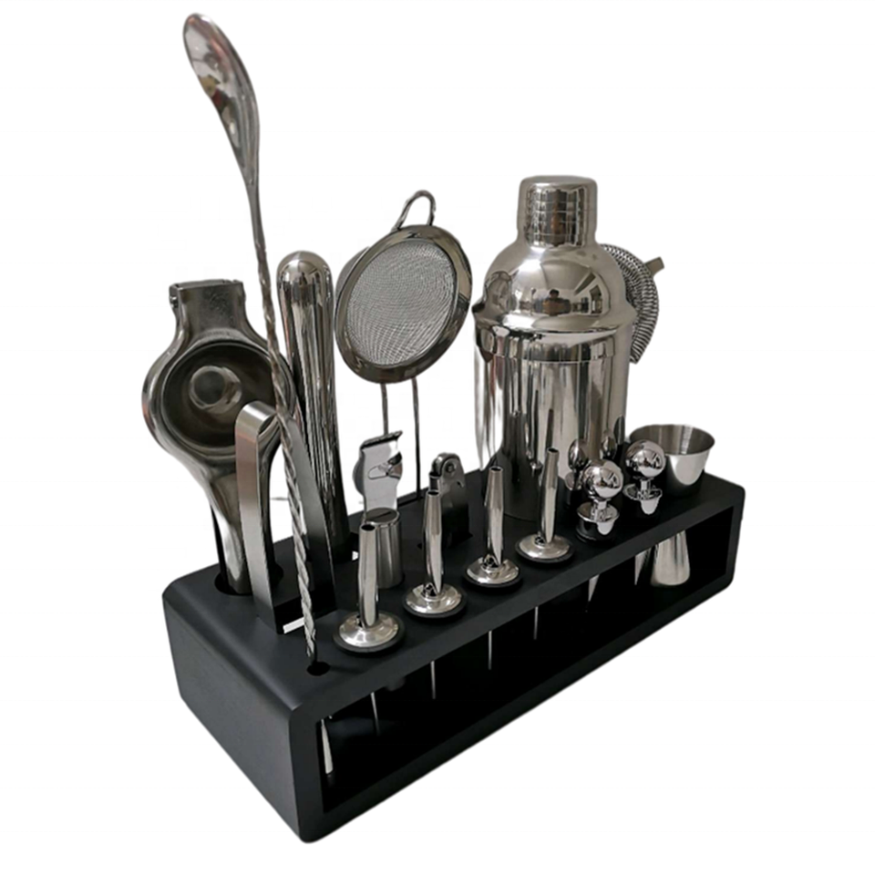 High Quality Custom Logo Mixology Stainless Steel Bar Tools Set Includes Bartender Cocktail Shaker Kit Bamboo Stand Bar Sets