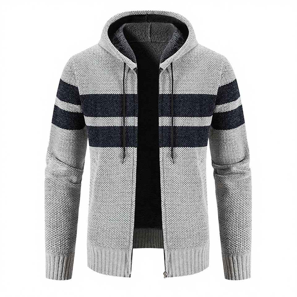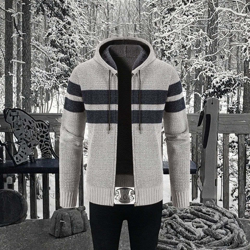 High Quality Custom Men Fleece-Lined Striped Hooded Cardigan Winter Full-Zip Breathable Knit Anti-Pilling Polyester In-Stock
