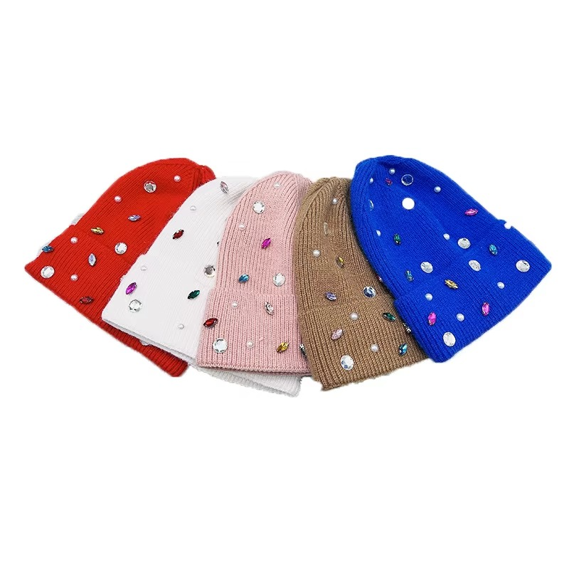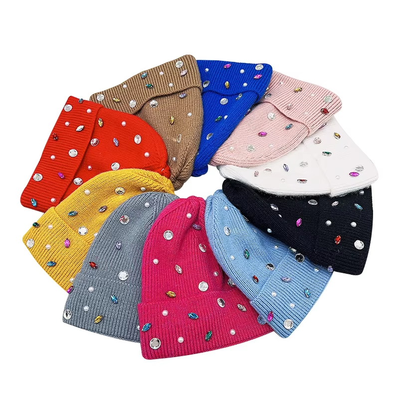 High Quality Custom Winter Hats for Women Knitted Beanies Cap Logo Wholesale Colorful Crystal Rhinestone Acrylic Beanie Hats