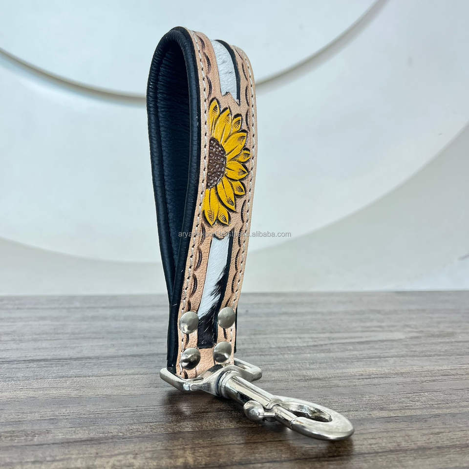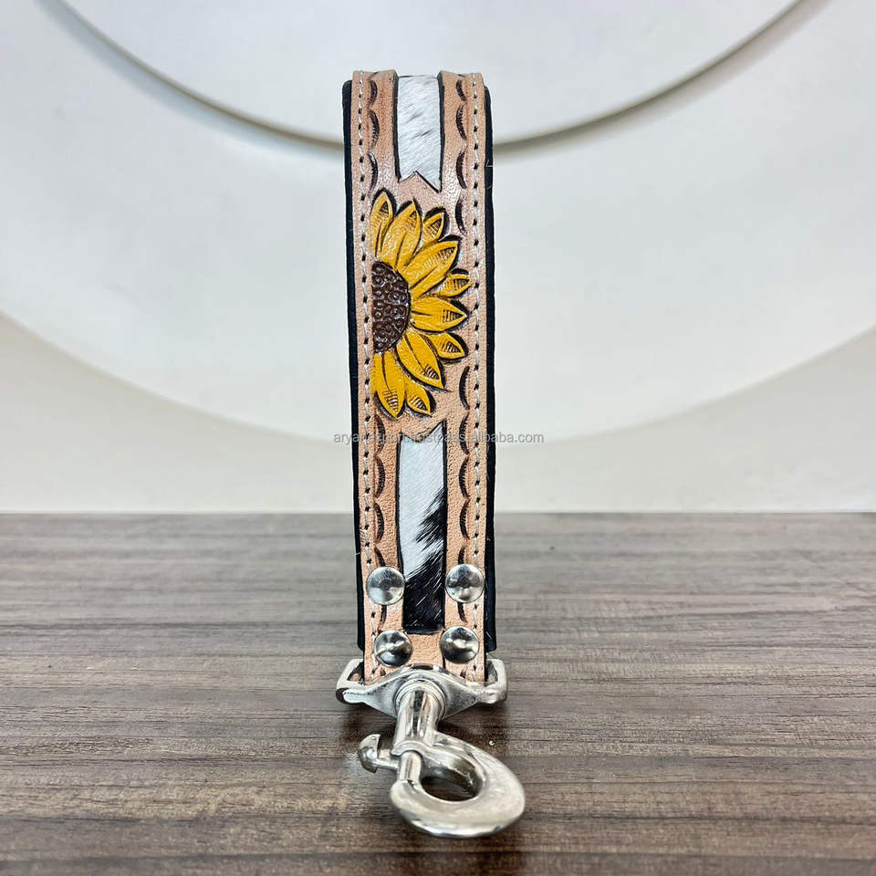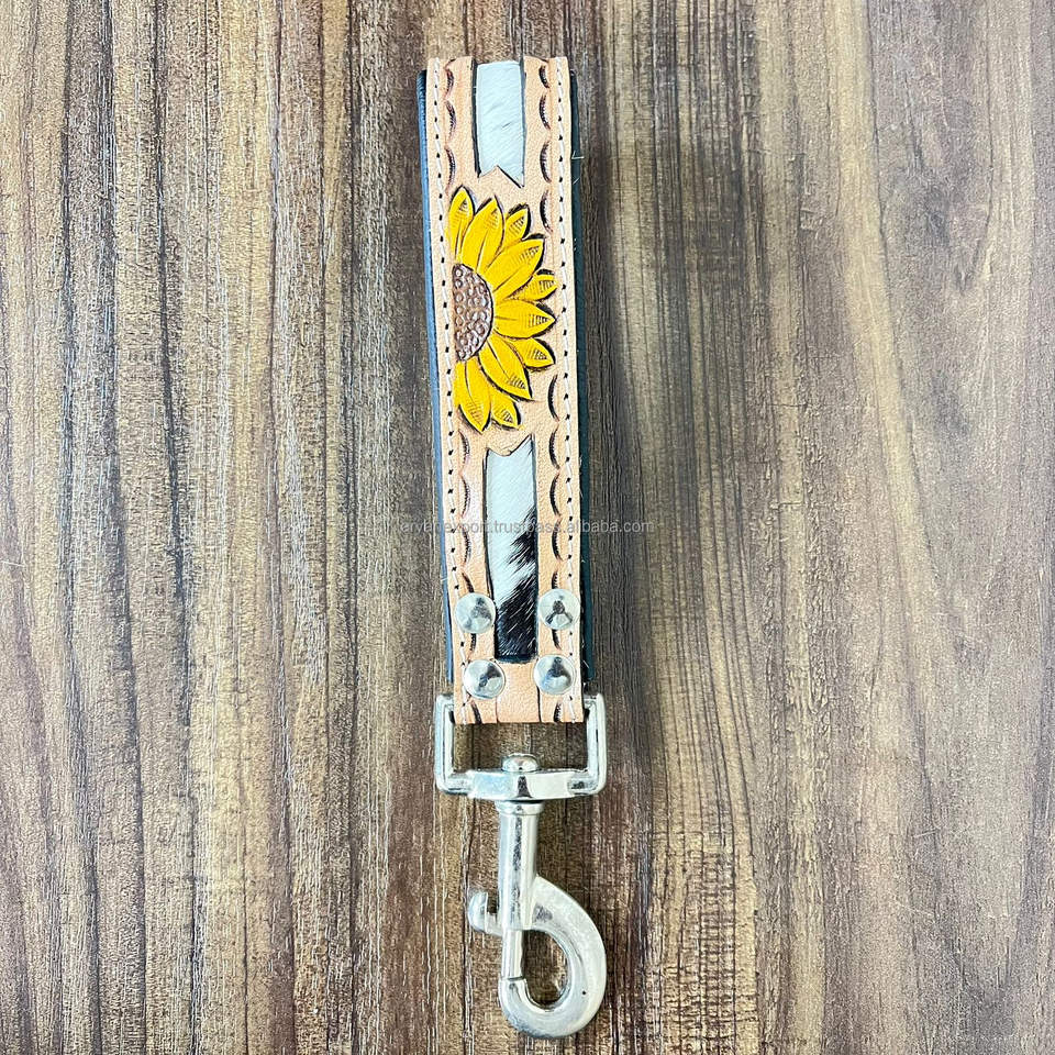High Quality Customizable Dog Leads Hand Tooled Genuine Leather Sunflower Design Handle Traffic Leash for Dogs Pet Accessories