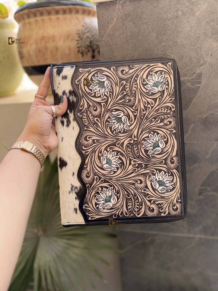 High Quality Customized Genuine Leather Floral Document Portfolio New Arrival Tooled Leather Business File Organizer Gift DEV