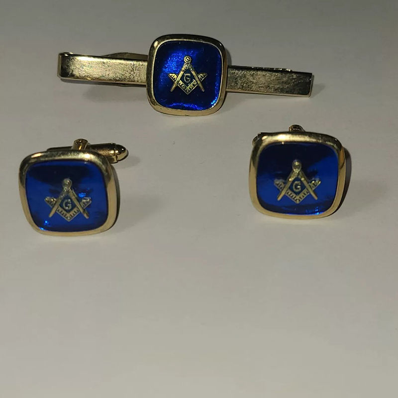 High Quality Customized Vintage Masonic Blue Enamel Gold Tone Cufflinks Tie Clips Master Mason Regalia Set Fashion Accessory