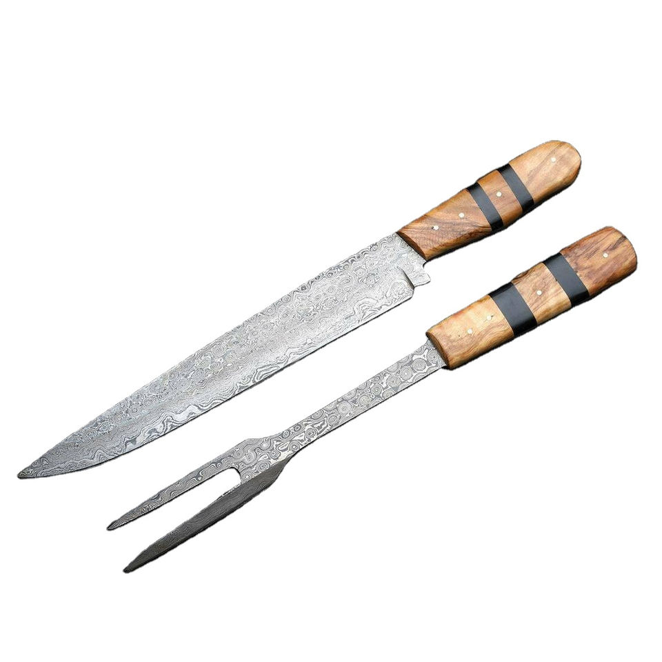 Ergonomic Grip Damascus Steel BBQ Slicing Knife Set with Fork High Quality Kitchen Knives for Carving