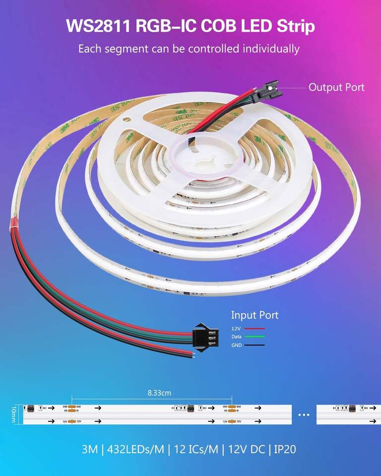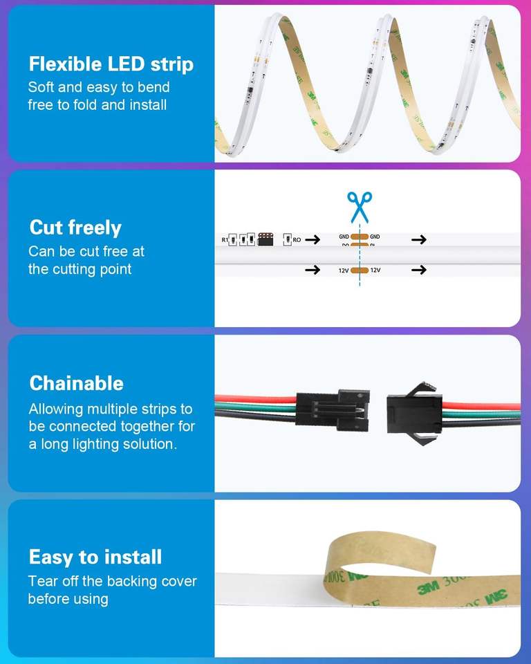 High Quality Decor COB Light 24VDC USB LED Strip RGB+W LED Light TV Backlight Dot Free Strip Cob Led Strip 12V