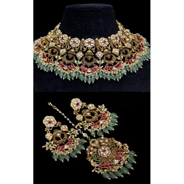 High Quality Designer Gold Plated Stones And Pearls Look Necklace Set With Earrings Tikka Wedding Wear Collection For Women