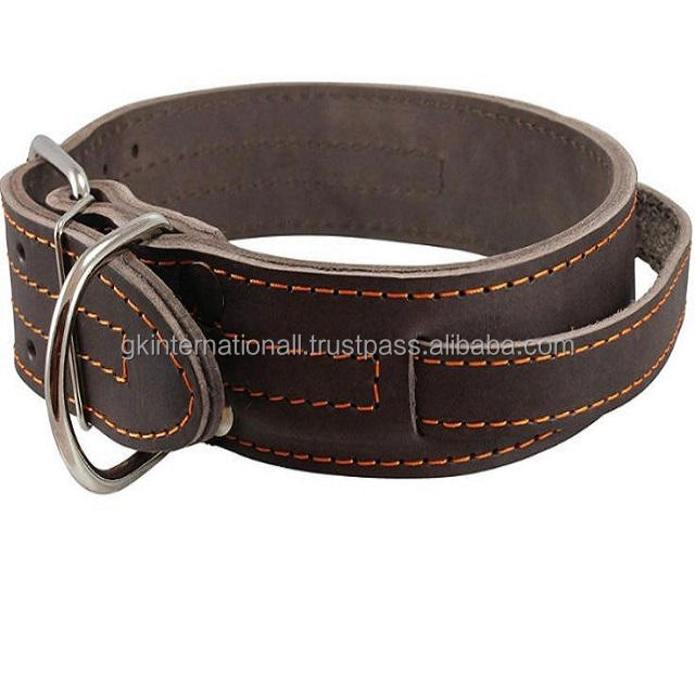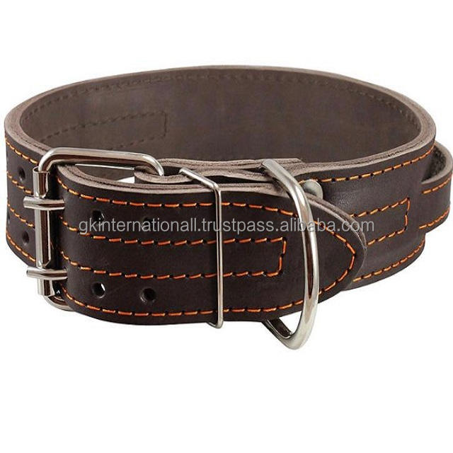 High Quality Double Ply Thick Genuine Leather Dog Collar Fastens with Heavy Duty Double Pins Buckle and Strong Waxed Stitching