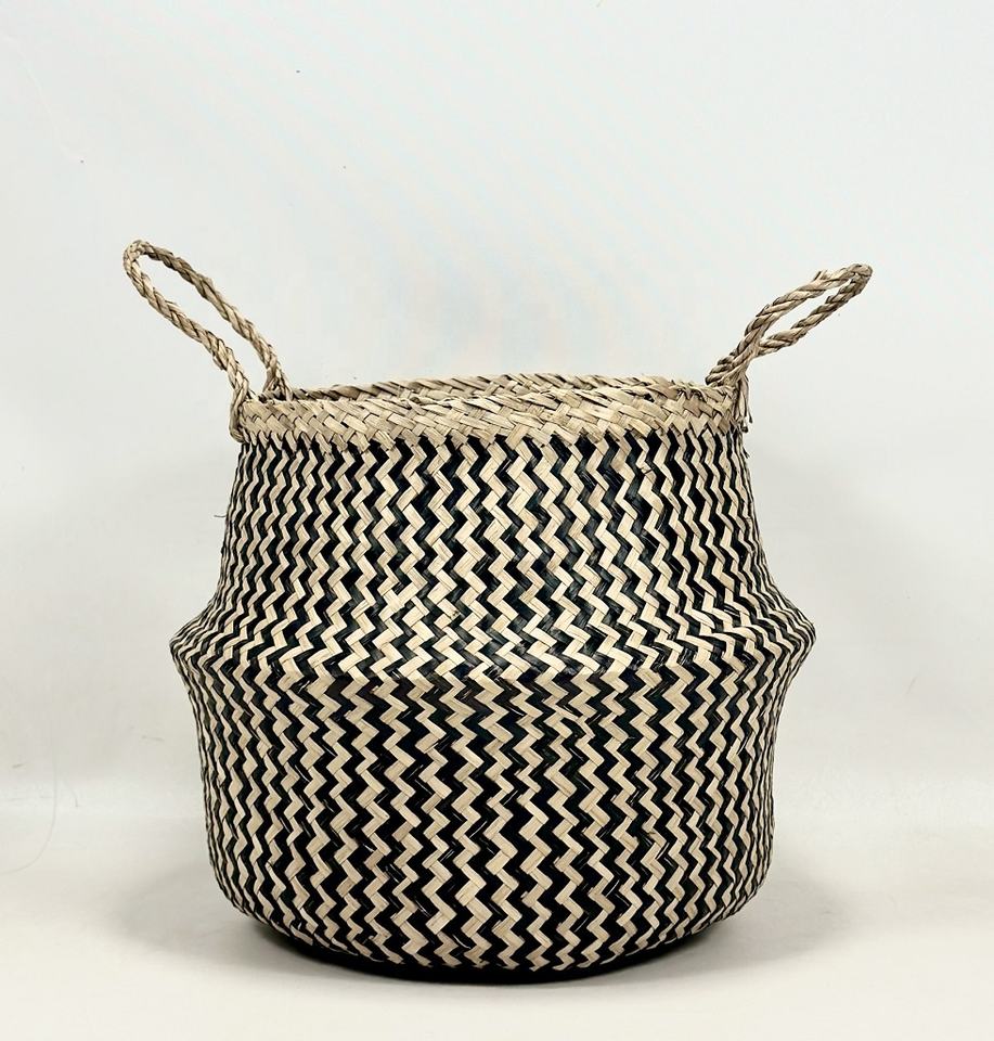 High Quality Eco-Friendly Natural Seagrass Foldable Belly Planter Storage Basket Natural Color Pompoms Best Selling Sundries