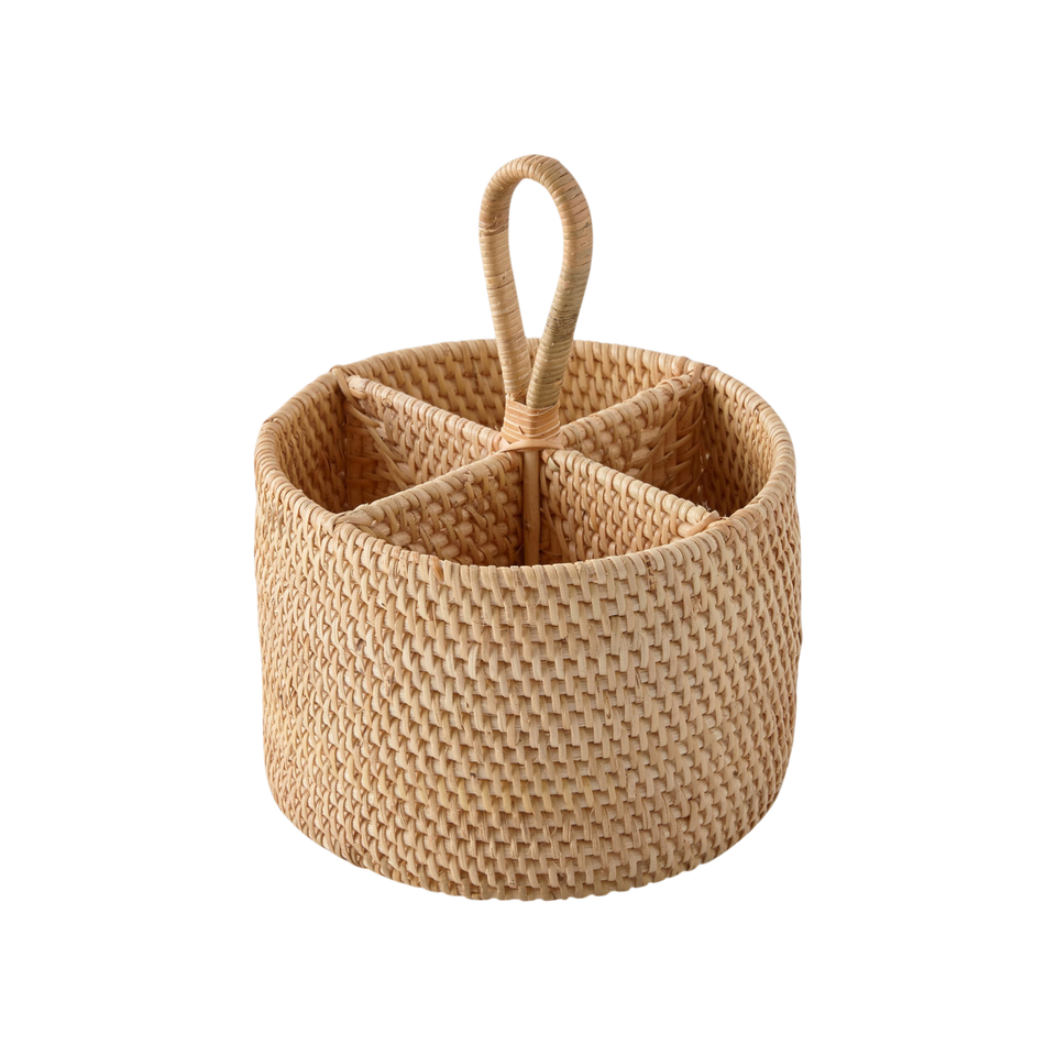 Round Rattan 4-Compartment Handwoven Utensil Holder
