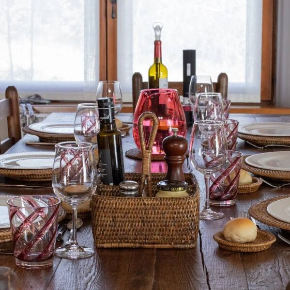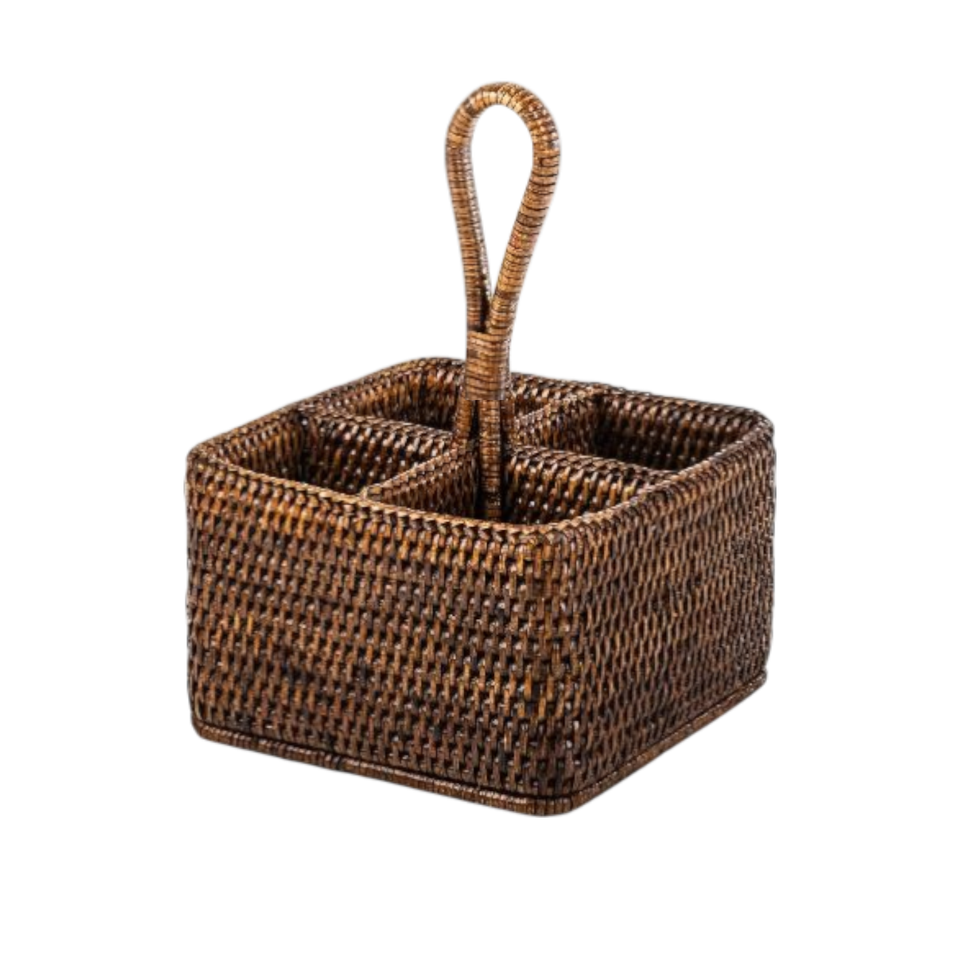 High Quality Eco-Friendly Lightweight Food Safe Square Rattan 4-Compartment Handwoven Utensil Holder Handle Utensil Caddy