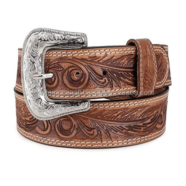 High Quality Embossed Logo Flower Pattern Western Belt Italian Cowhide Full Grain Vintage Genuine Leather Belt for Men