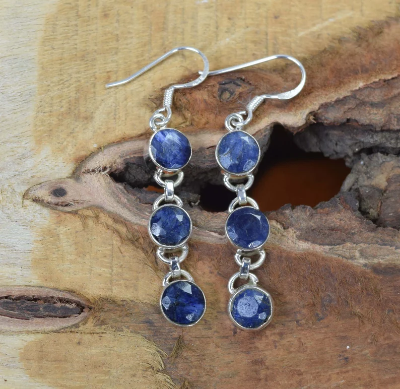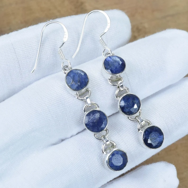 High Quality 925 Sterling Silver Dangle Earrings Fashion Blue Sapphire Faceted 3 Gemstone September Birthstone Handmade Hook