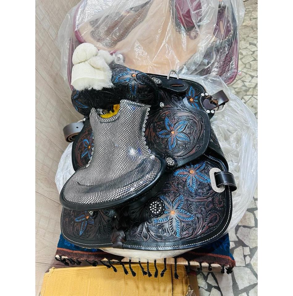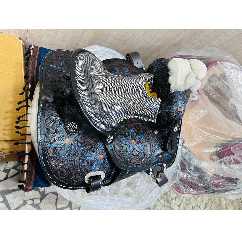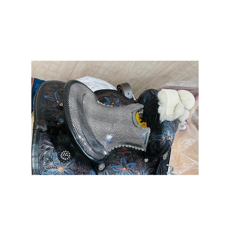 High Quality Floral Hand Tooled Genuine Leather Western Barrel Horse Saddle Set Black Padded Seat Plastic Wholesale Hot Selling