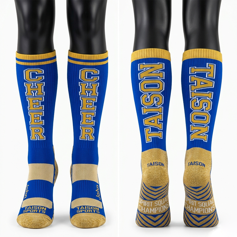 High Quality GSM Breathable Cotton Polyester Women Cheerleading Socks Blue White Yellow Panels Reinforced Heel Toe Knitted Logo