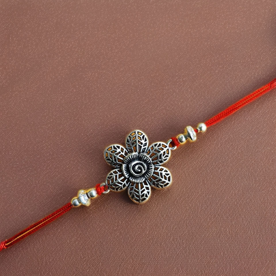 Product Name:Oxidised Silver Rakhi with Engraved Flower for Brother