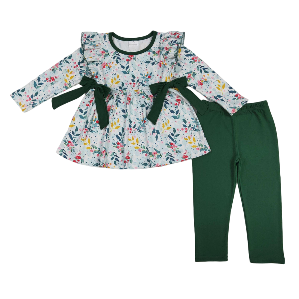 High Quality Girls Toddler Clothing Sets Colorful Flowers Bows Long Sleeve Dark Green Pants Girls Pajamas New Arrival Hot Sale