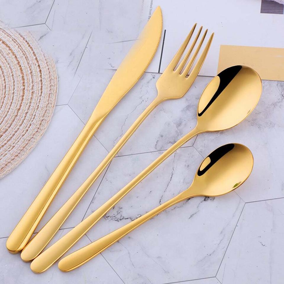 High Quality Gold Flat Long Handle Cutlery Set Mirror PC Material Spoon Fork Knife Vintage Luxury Flatware School Food Gifts