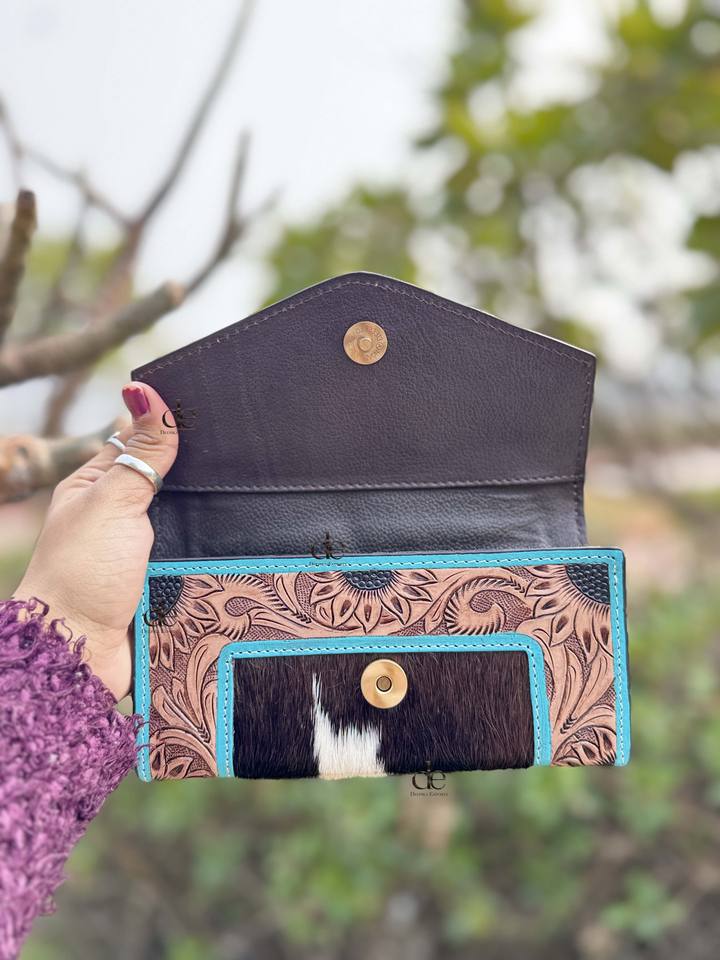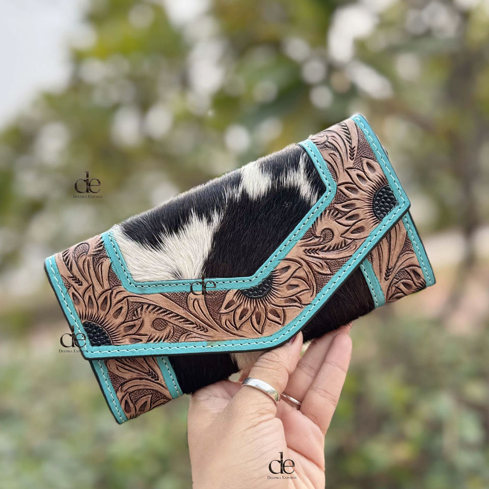 High Quality Hand Tooled Carving Wallet Clutch Stylish Cowhide Fur Leather Wallet Multi Uses Western Leather Wallets