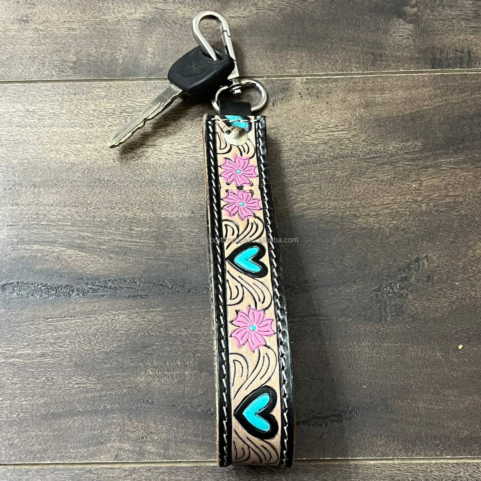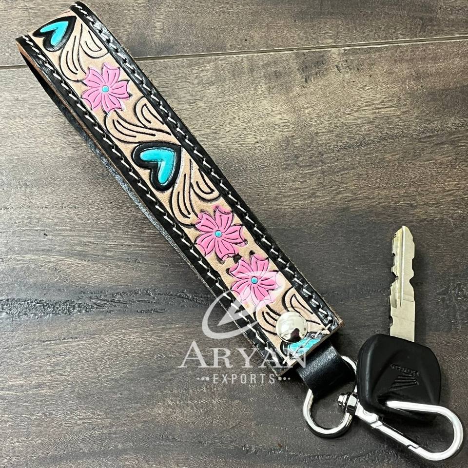High Quality Hand-Tooled Genuine Leather Wristlet Keychain Custom Engraved Vintage Style Handmade Cow Leather Key Fobs for Women
