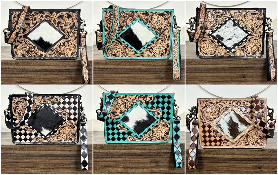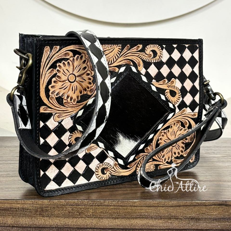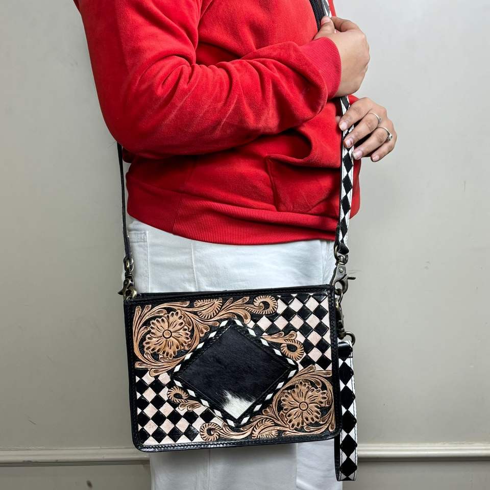 Product name:Hand Tooled Checkered Leather Sling Bag With Wristlet