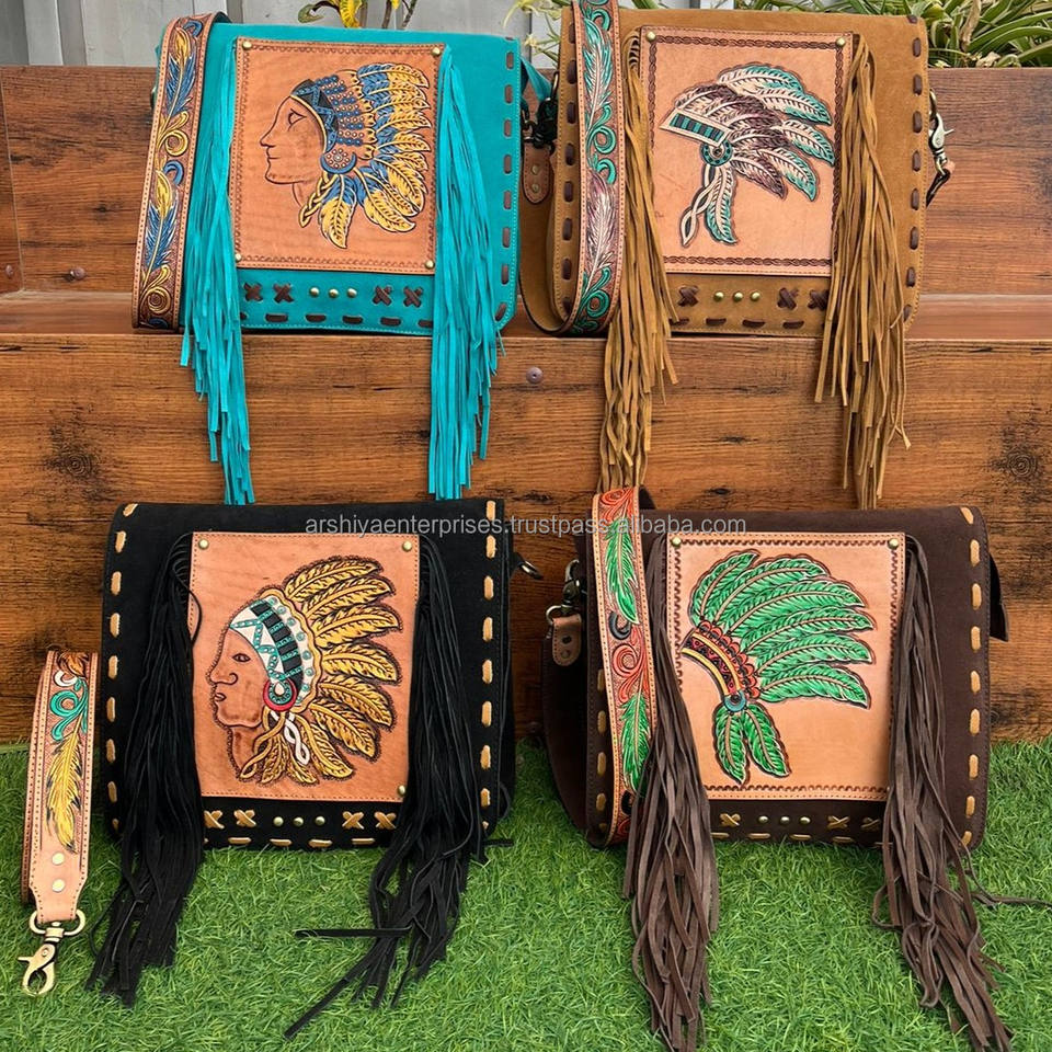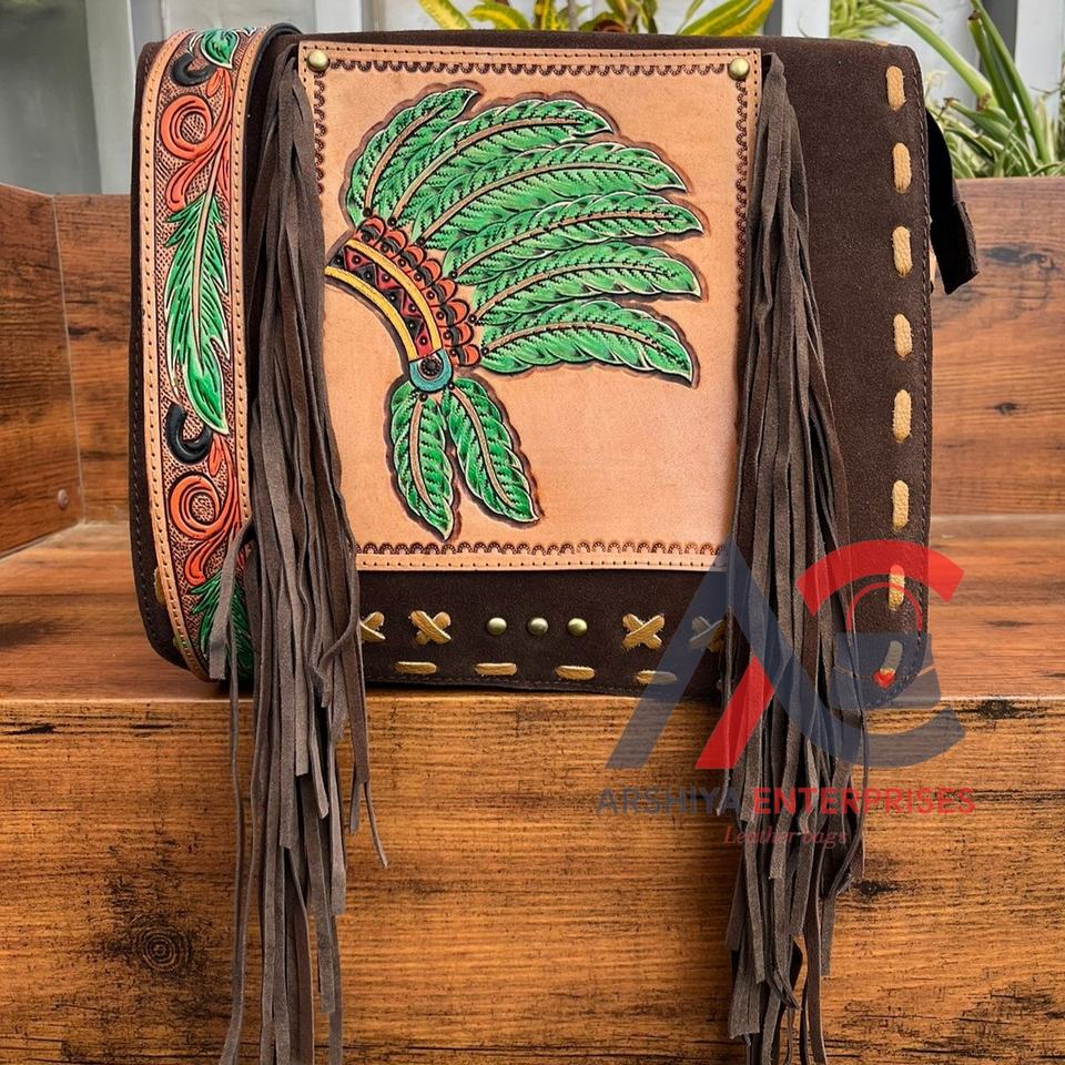 Product name:Hand Tooled Suede Leather Fringe Bag