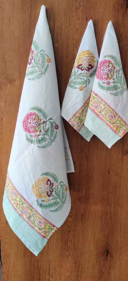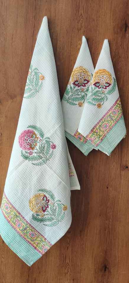 High Quality Handblock Printed Waffle Cotton Towel Set Luxury & Highly Absorbent Solid Color Pattern
