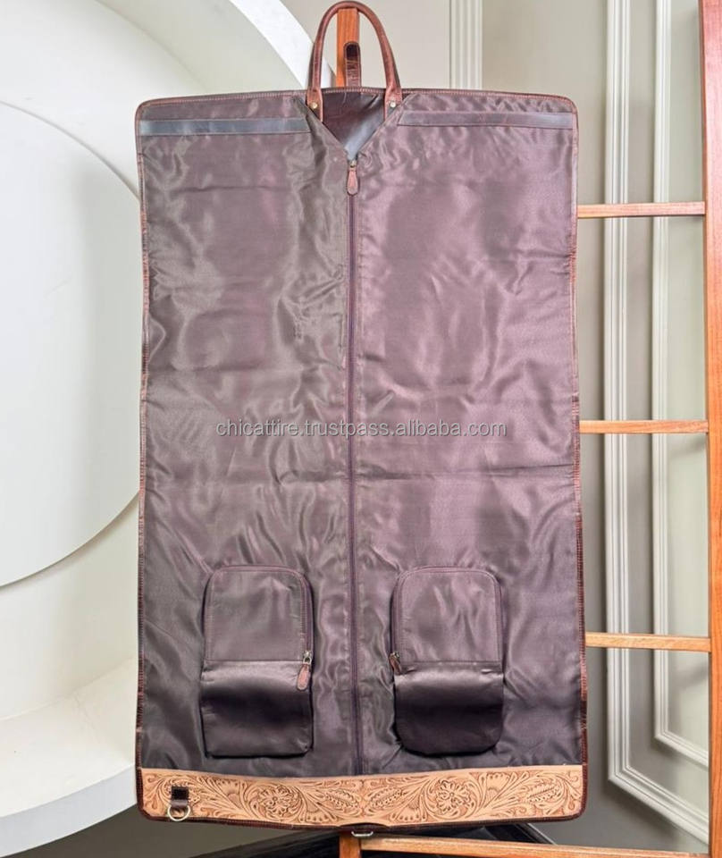 High Quality Handcrafted Leather Garment Bag with Tooled Design Foldable Travel Suit Cover with Zipper & Pockets for Men & Women