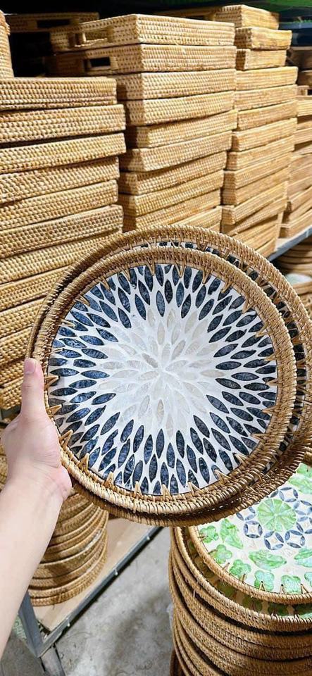 High Quality Handicrafts Natural Rattan Serving Tray Environmentally Friendly Mother of Pearl Inlay Crafted Tray