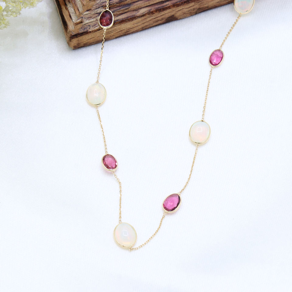 Item Name:Natural Opal & Pink Tourmaline Gold Necklace
