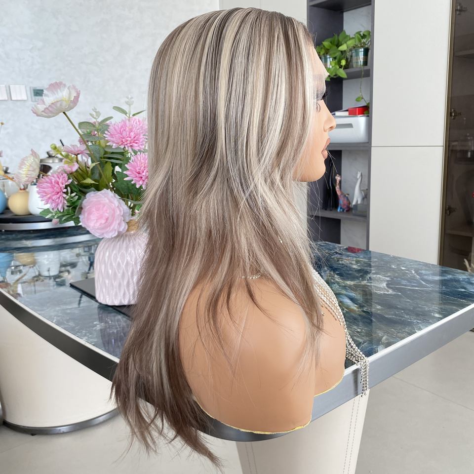 High Quality Heat Resistant Ash Platinum Free 13x4 HD Per Plucked Synthetic Hair Lace Wig Layered 16inch Transparent