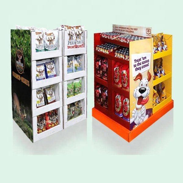 High Quality Heavy Duty Customized Corrugated Cardboard Pet Food Display Shelf Rack Stands Pet Store Displays