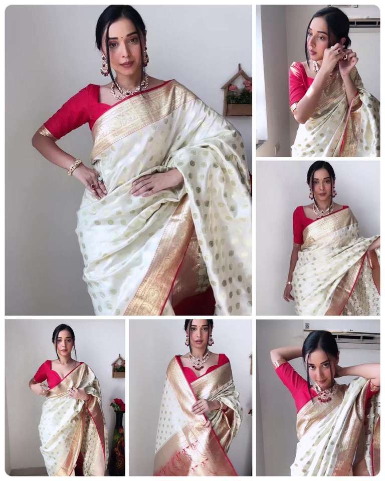 High Quality Heavy Jacquard Silk White color saree with Red jari Border Sarees with Golden Big Jacquard Weaving Border