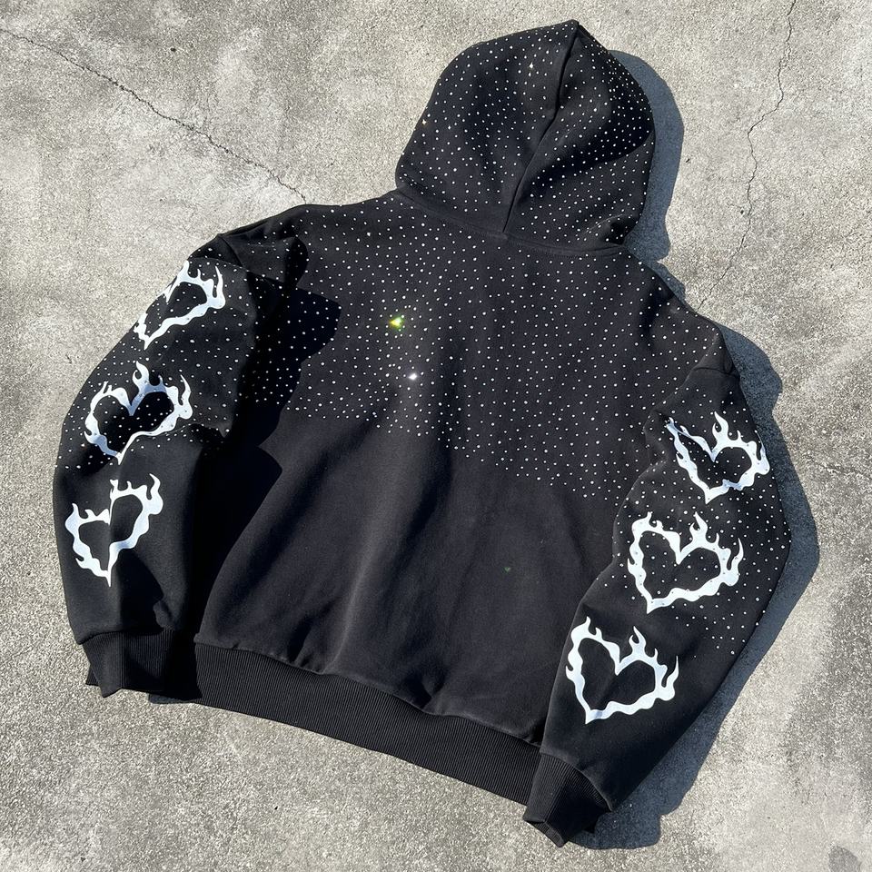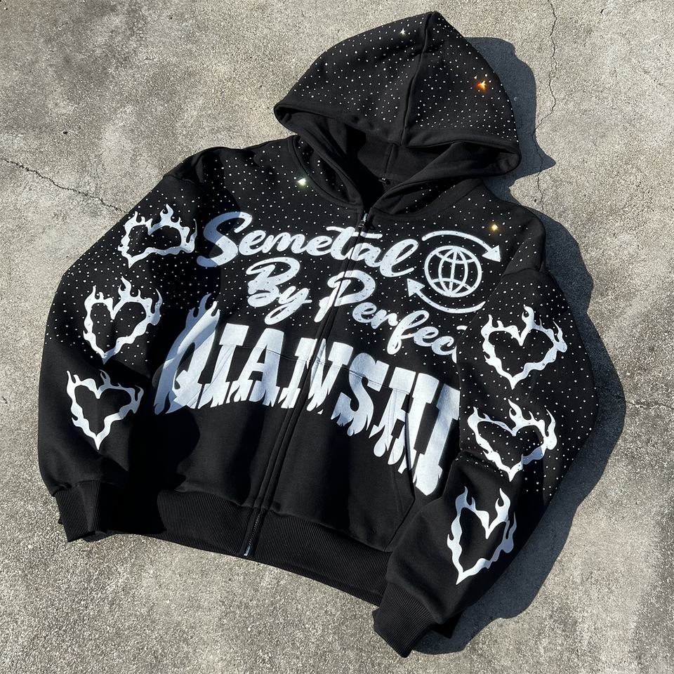 High Quality Heavyweight Drop Shoulder Hoodie Men Printed Oversized Cotton Hoodie Custom French Terry Rhinestone Zip Up Hoodie