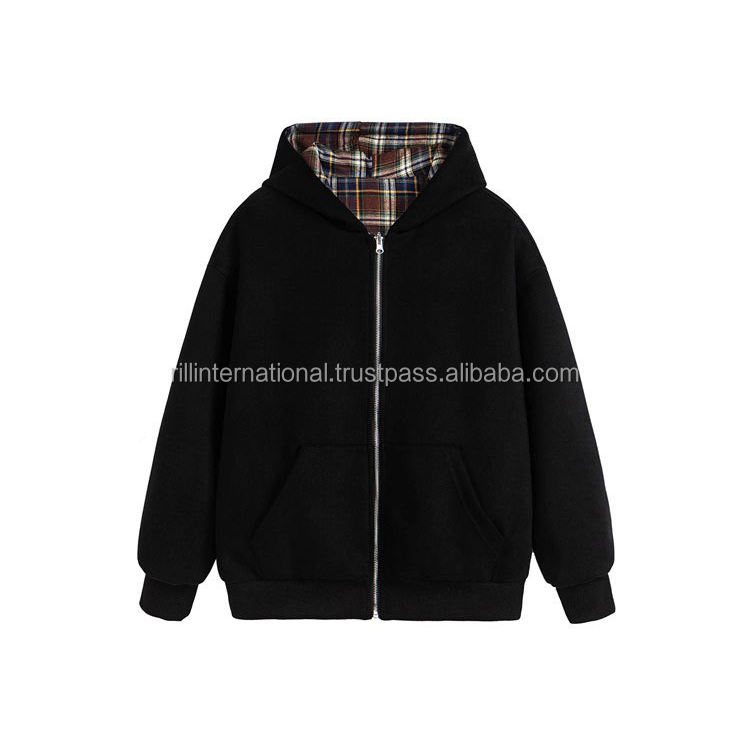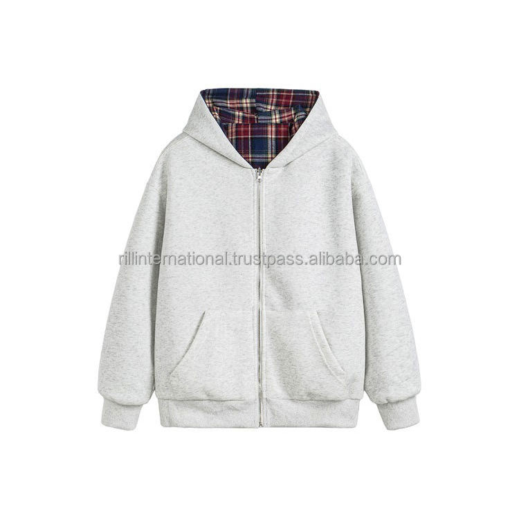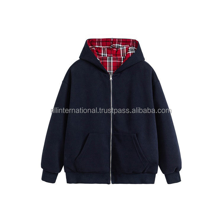 High Quality High Street 100% Cotton Spring Autumn Reversible Plaid Unisex Casual Full Zipper Hoodie Jacket