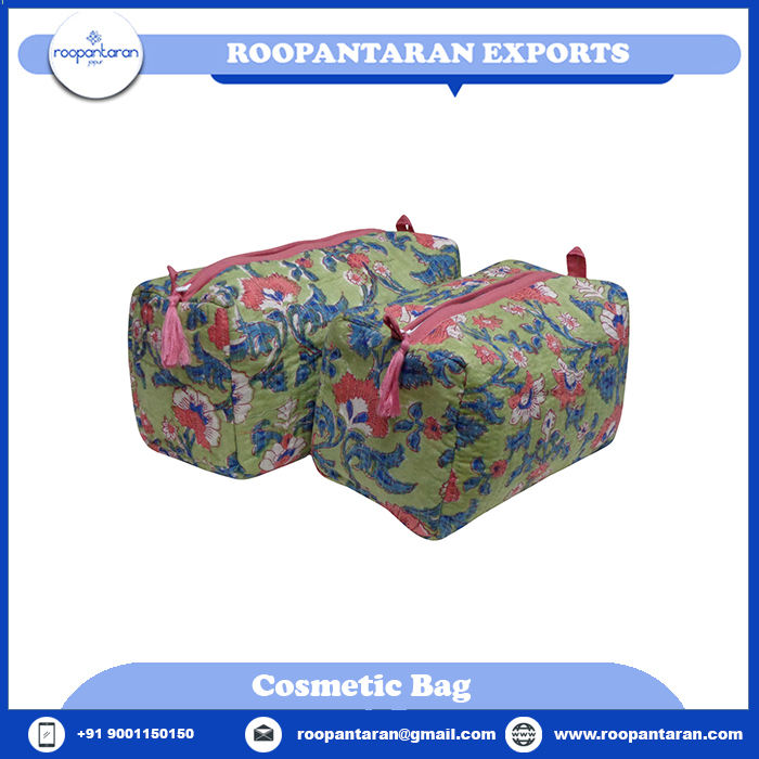 High Quality Indian Hand Block Printed Herringbone Green Cotton Toiletry Bag Elegant Evening Cosmetic Bag for Sale