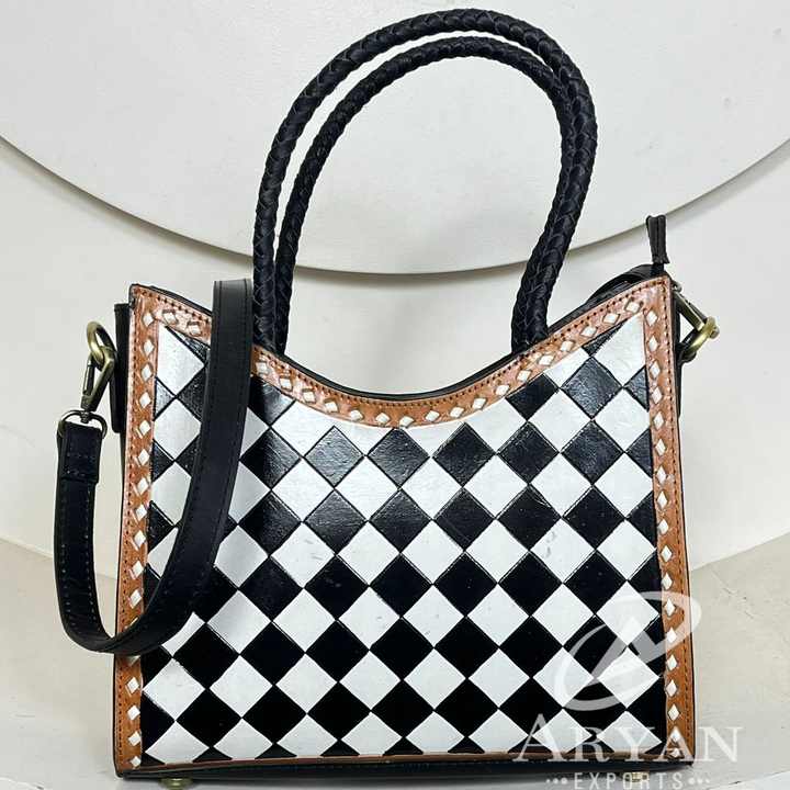 Product Name:Hand Tooled Checkered Leather Shoulder Tote Bag