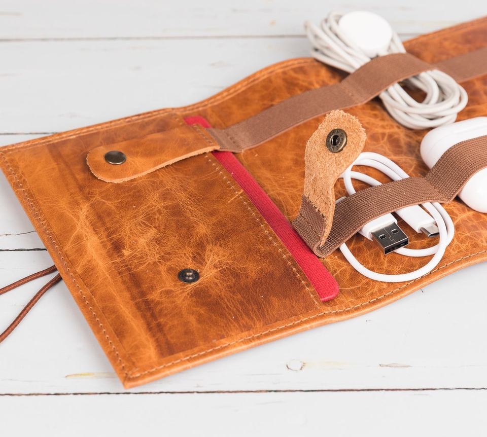 High Quality Leather Cable Organizer Cable Holder Handmade Cord Organizer Travel Charger Roll, Travel Case OEM & FBA Product