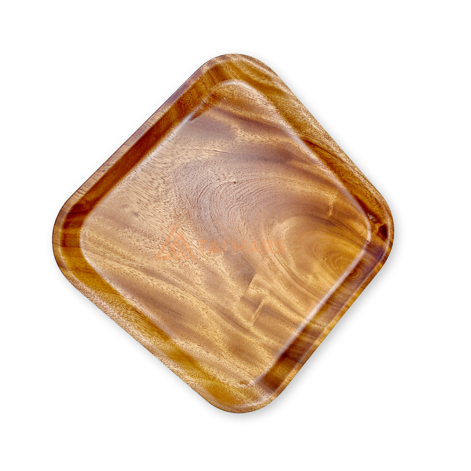 High Quality Lightweight Bamboo Square 140x140x18mm Khaya Wood Dinner Plate Classic Rounded Plant Pattern Serving Snack Dessert