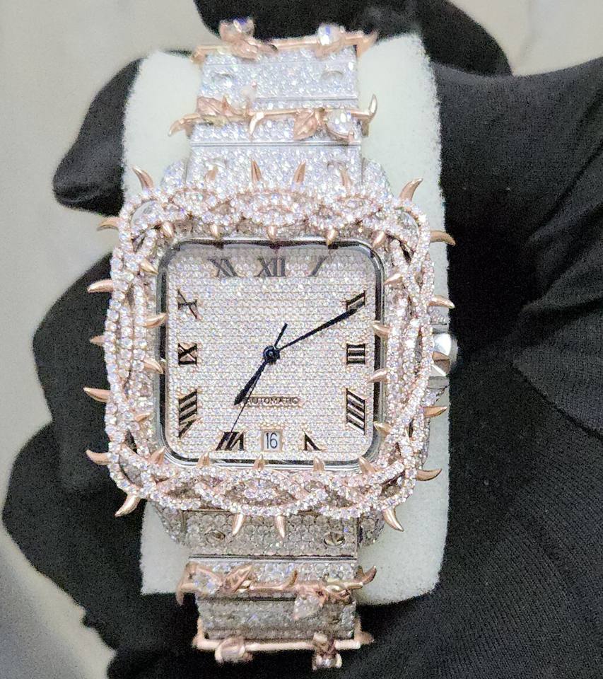 High Quality Luxury Customized Miyota Automatic Iced Red Face Sport Analog Watch Moissanite Diamond Hidden Clasp Stainless Steel