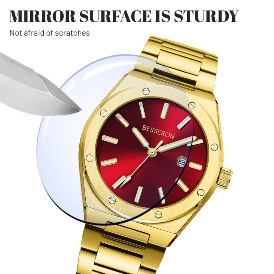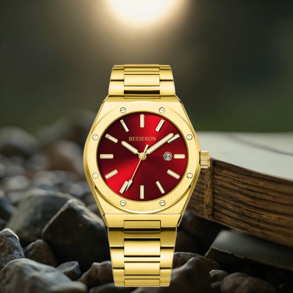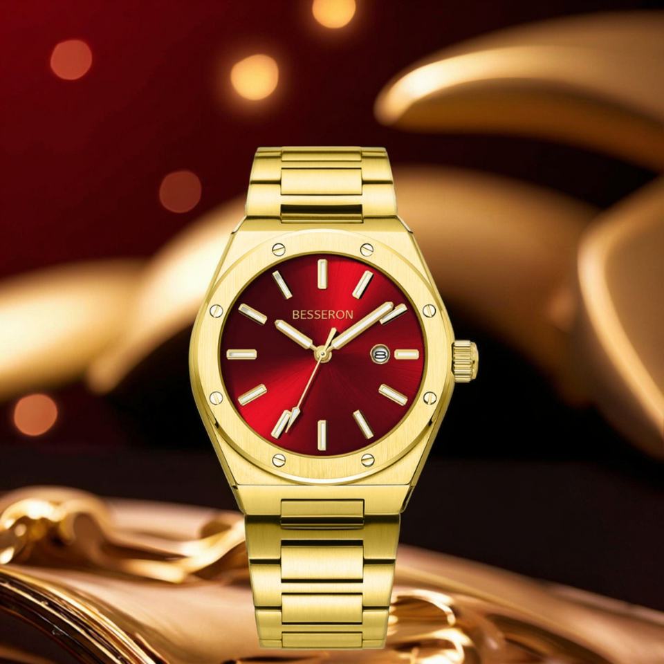 High Quality Luxury Fashion Business Custom Logo Red Sunshine Dial 18k Gold 42mm Stainless Steel Rubber Strap Waterproof Men's
