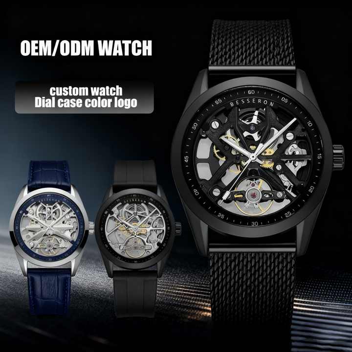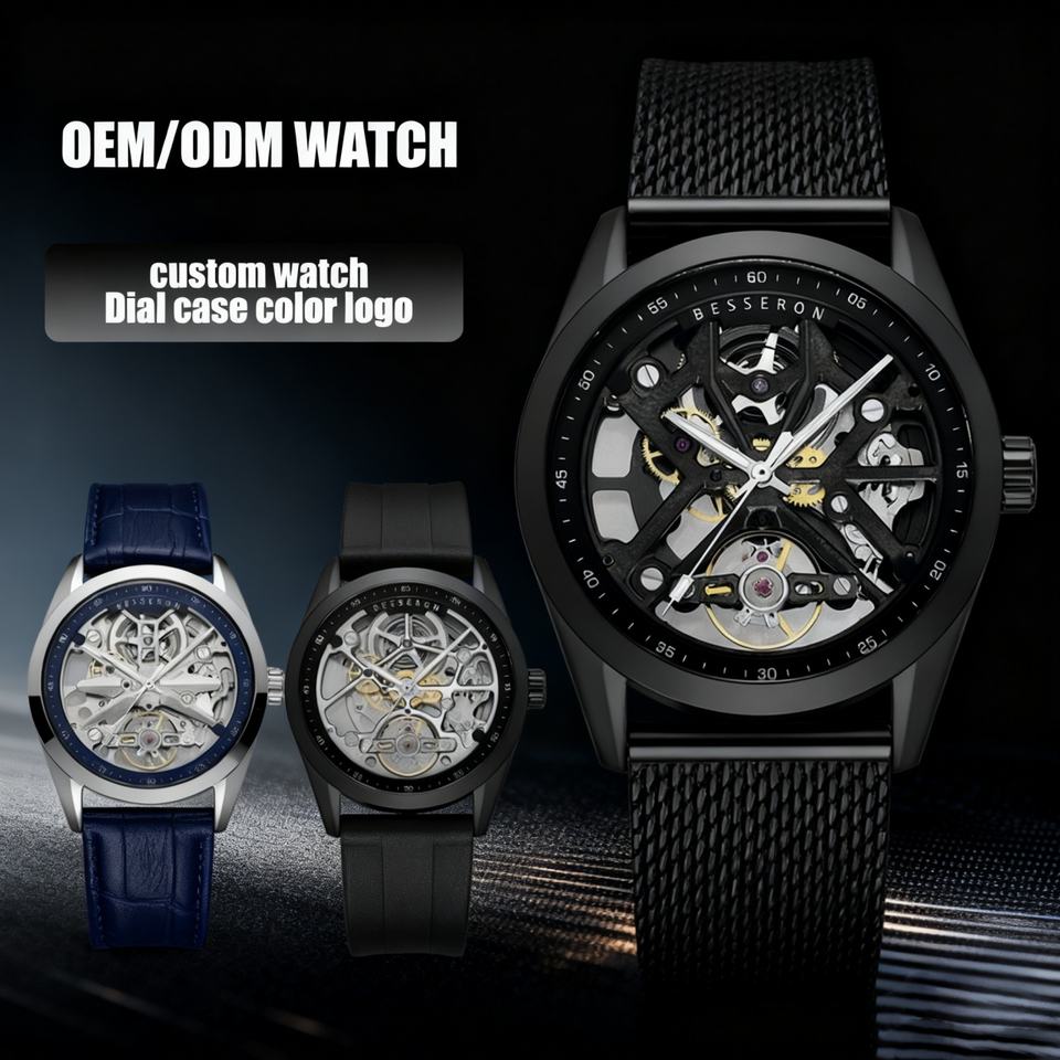High Quality Luxury Fashion Skeleton Mechanical Watch Pointer Sapphire Crystal Glass Stainless Steel Case 5BAR Waterproof Rubber