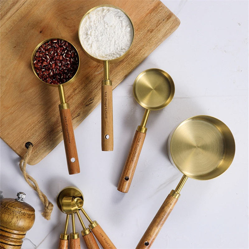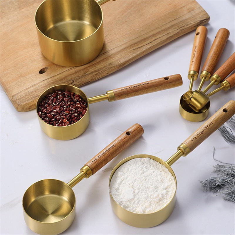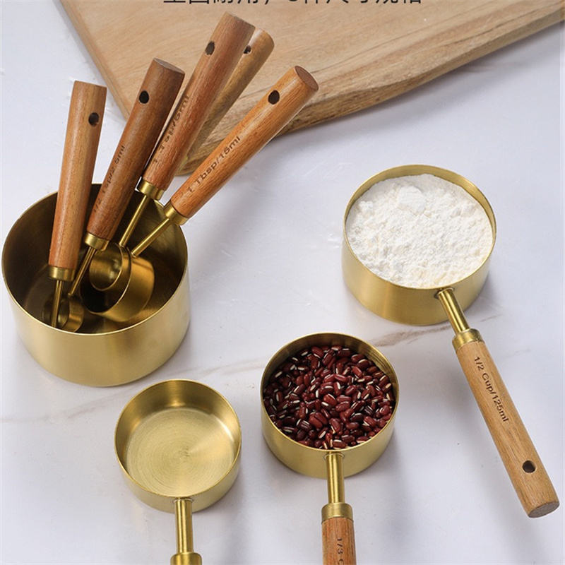 High Quality Measuring Baking Tools Set of 8 Gold Stainless Steel Measuring Cups and Spoons Set with Acacia Wood Handle
